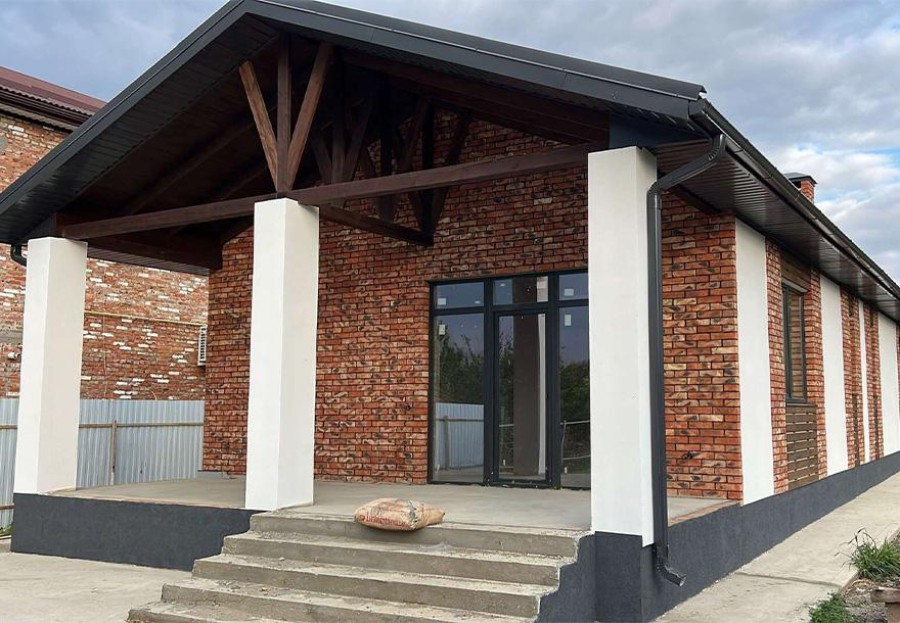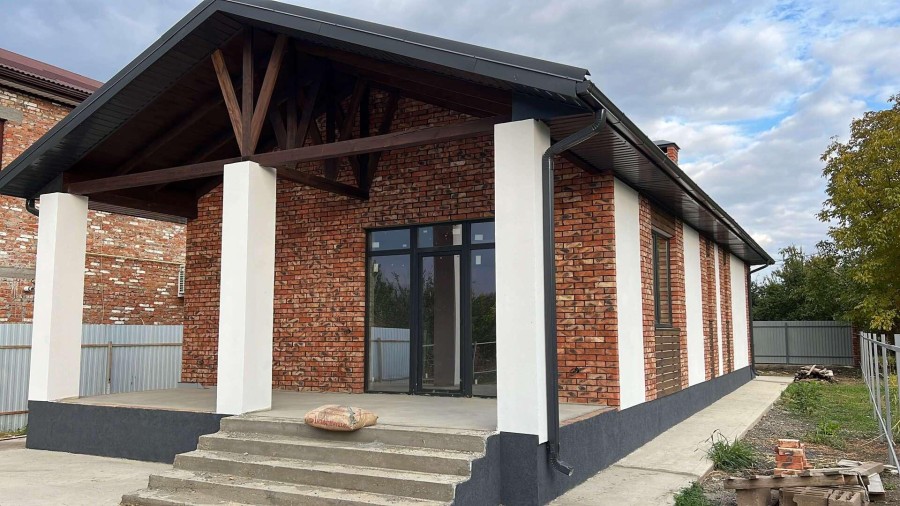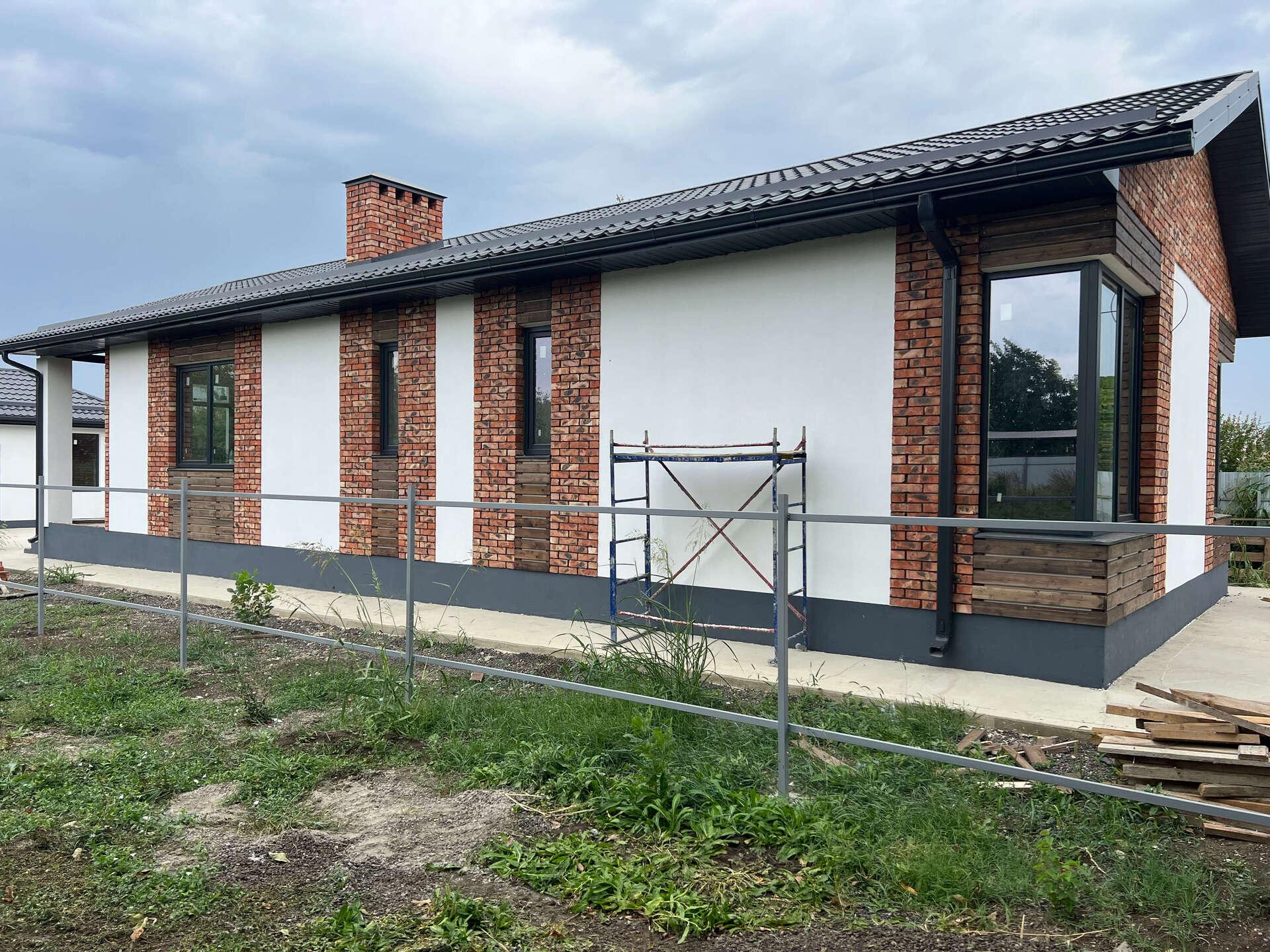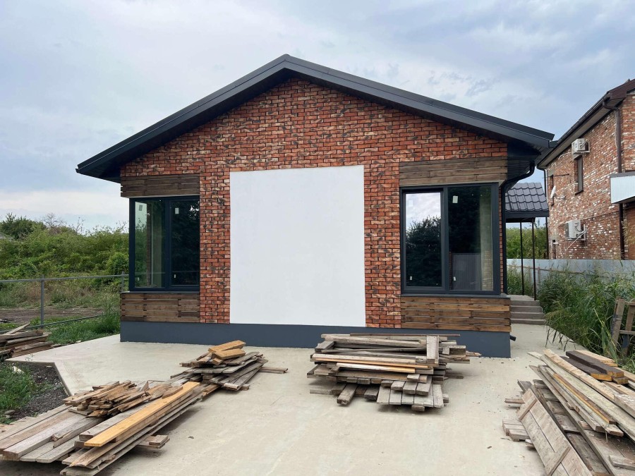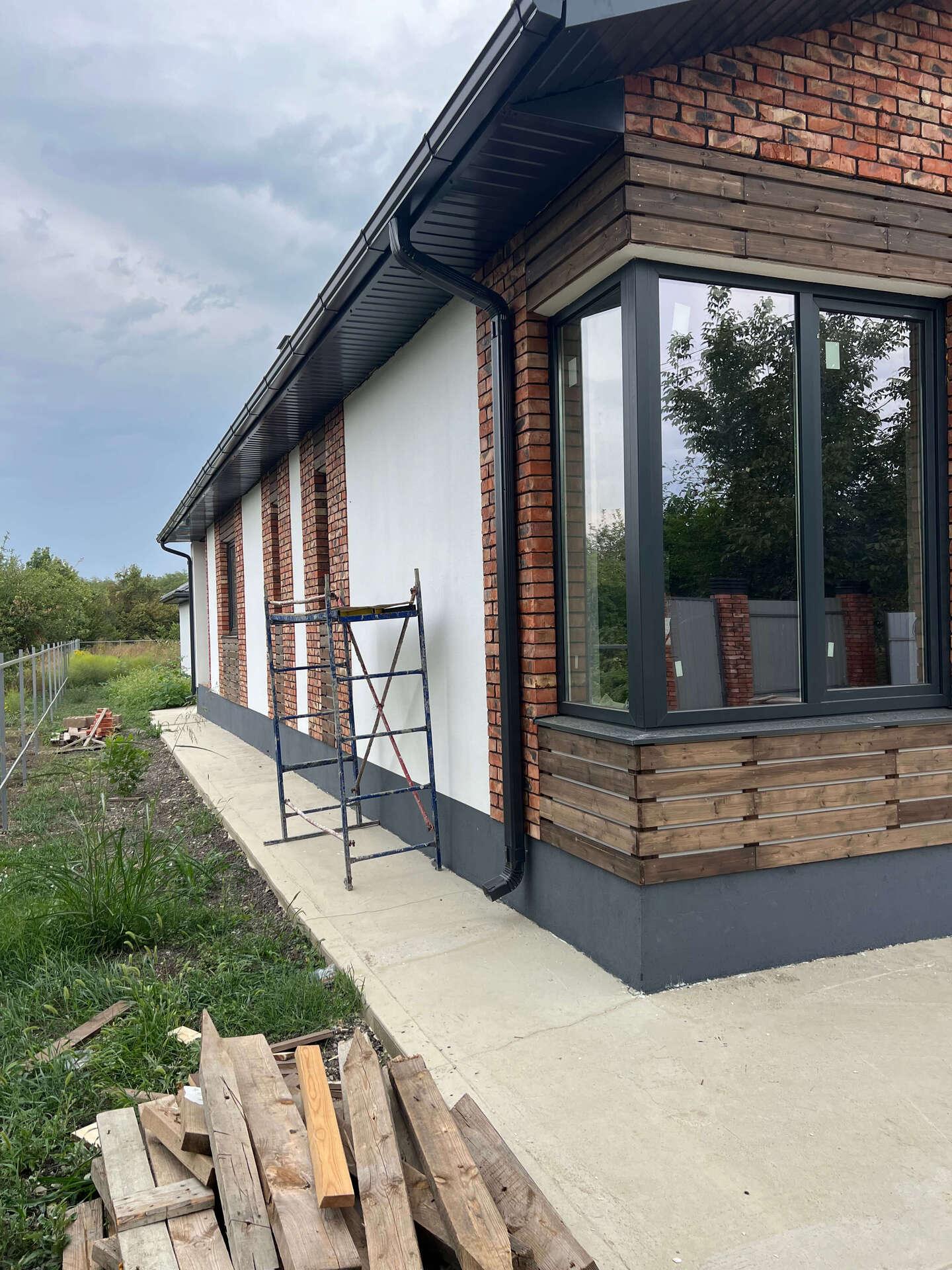 После чего снаружи частично был положен кирпич на черную кладочную смесь и частично газоблок 100*250*625, который в дальнейшем отделали мраморной белой крошкой.