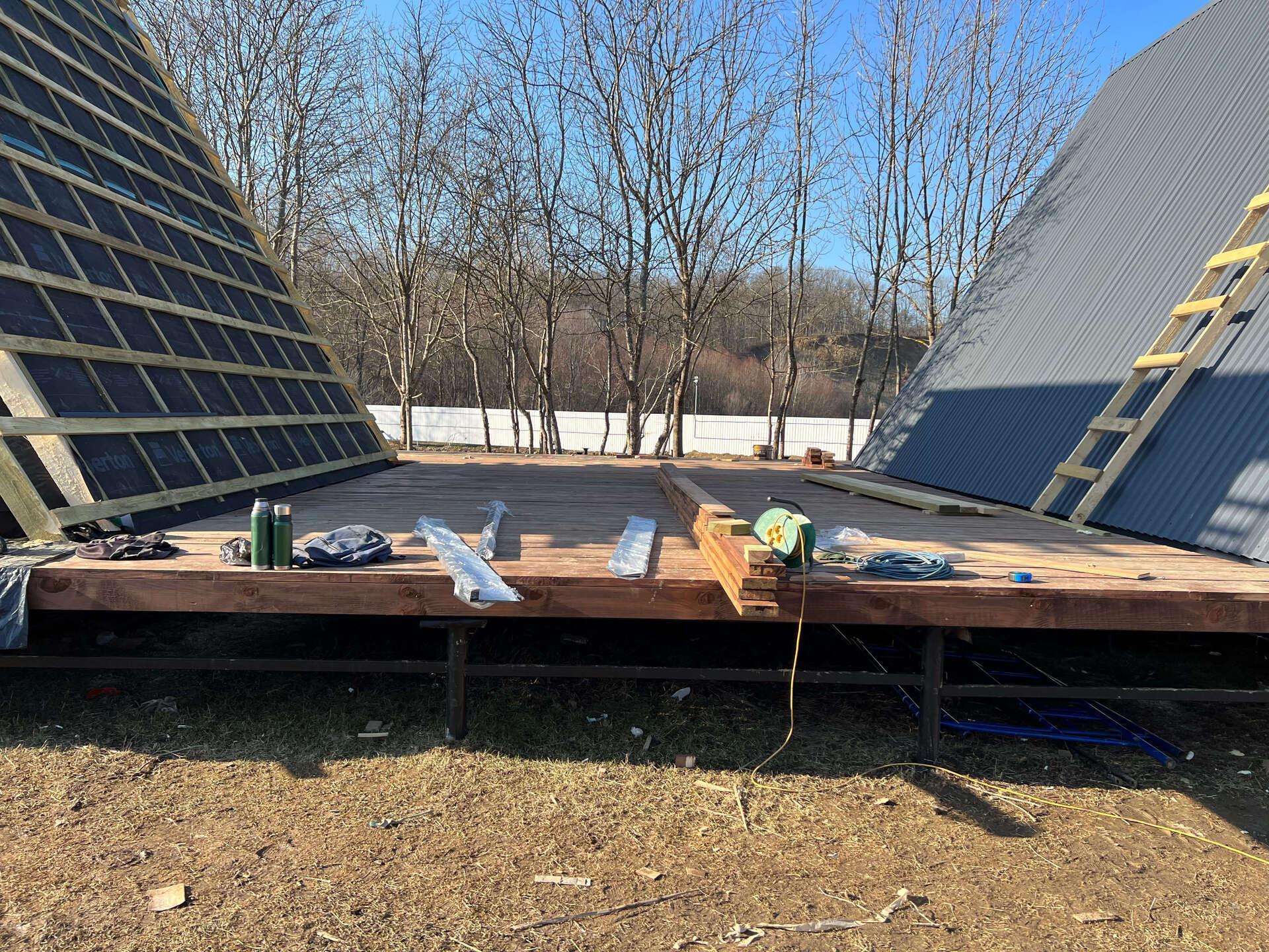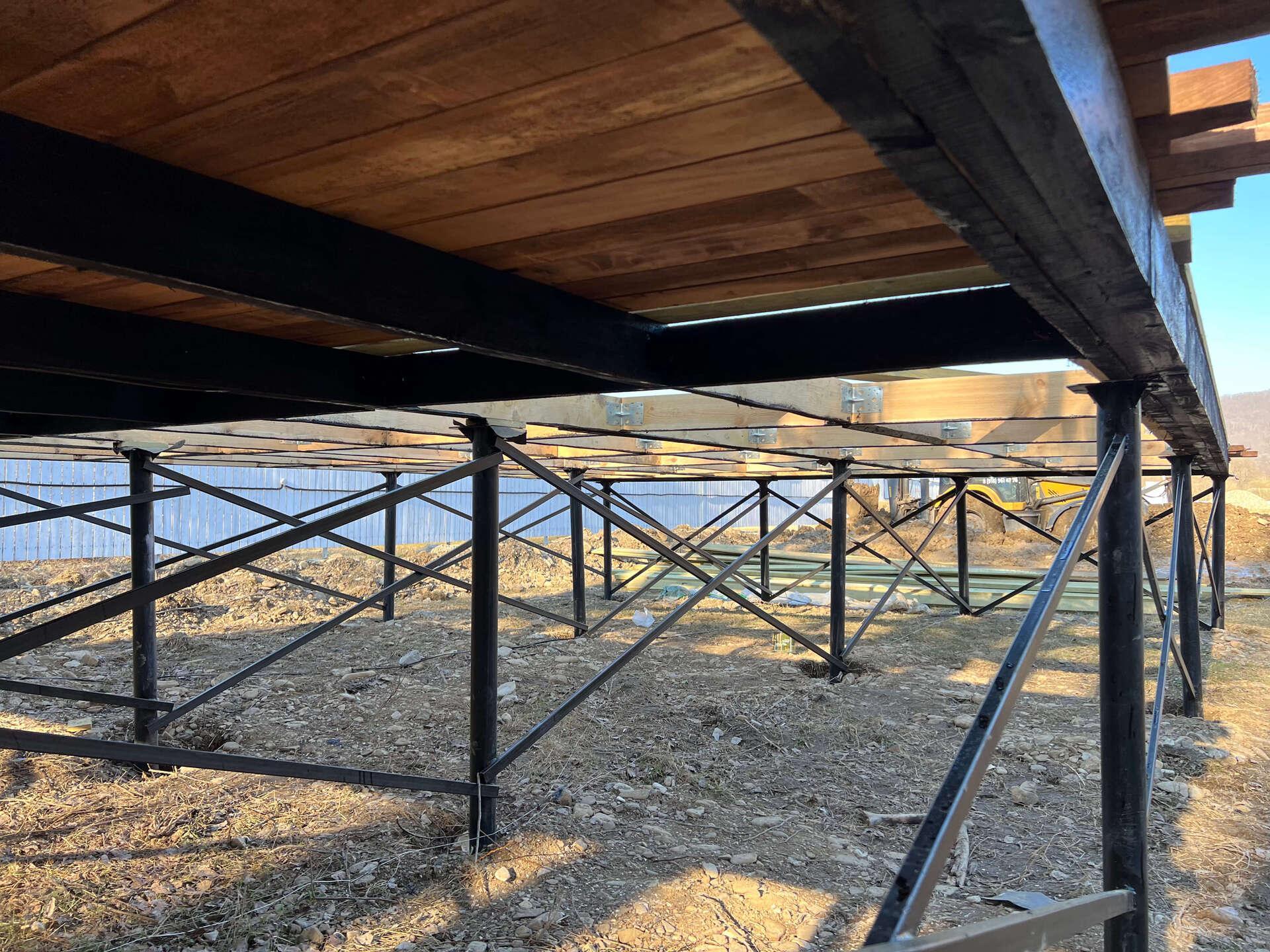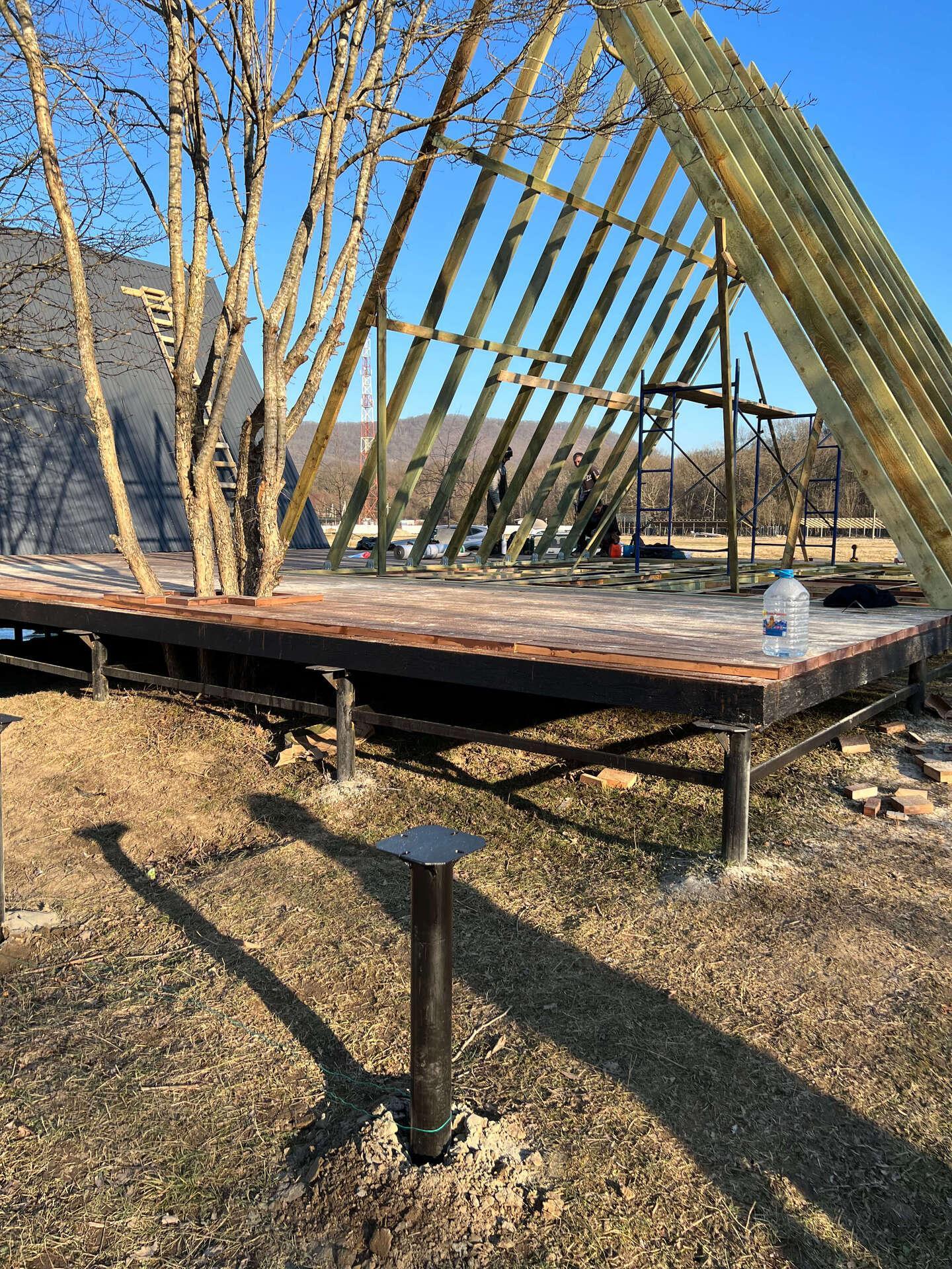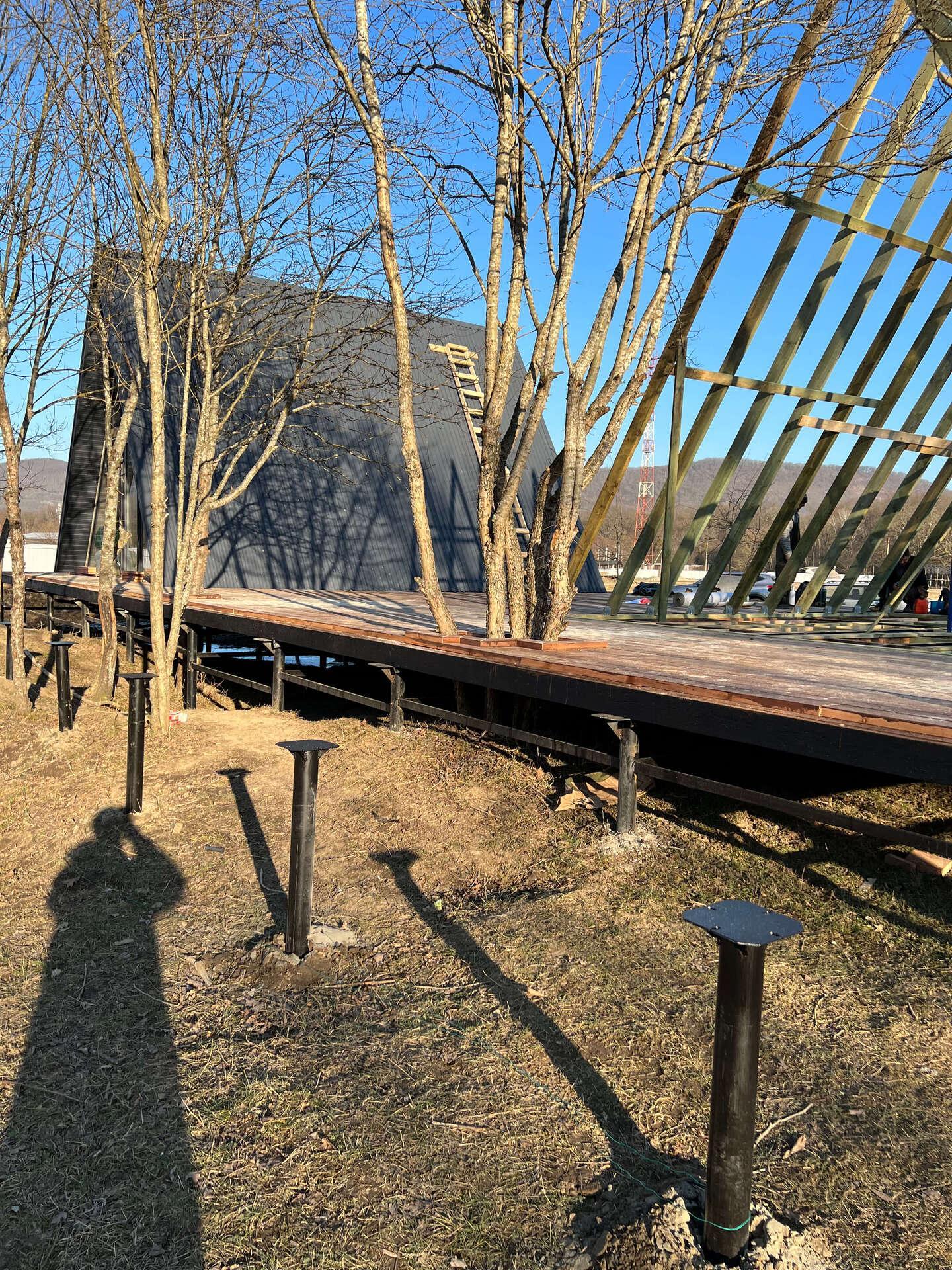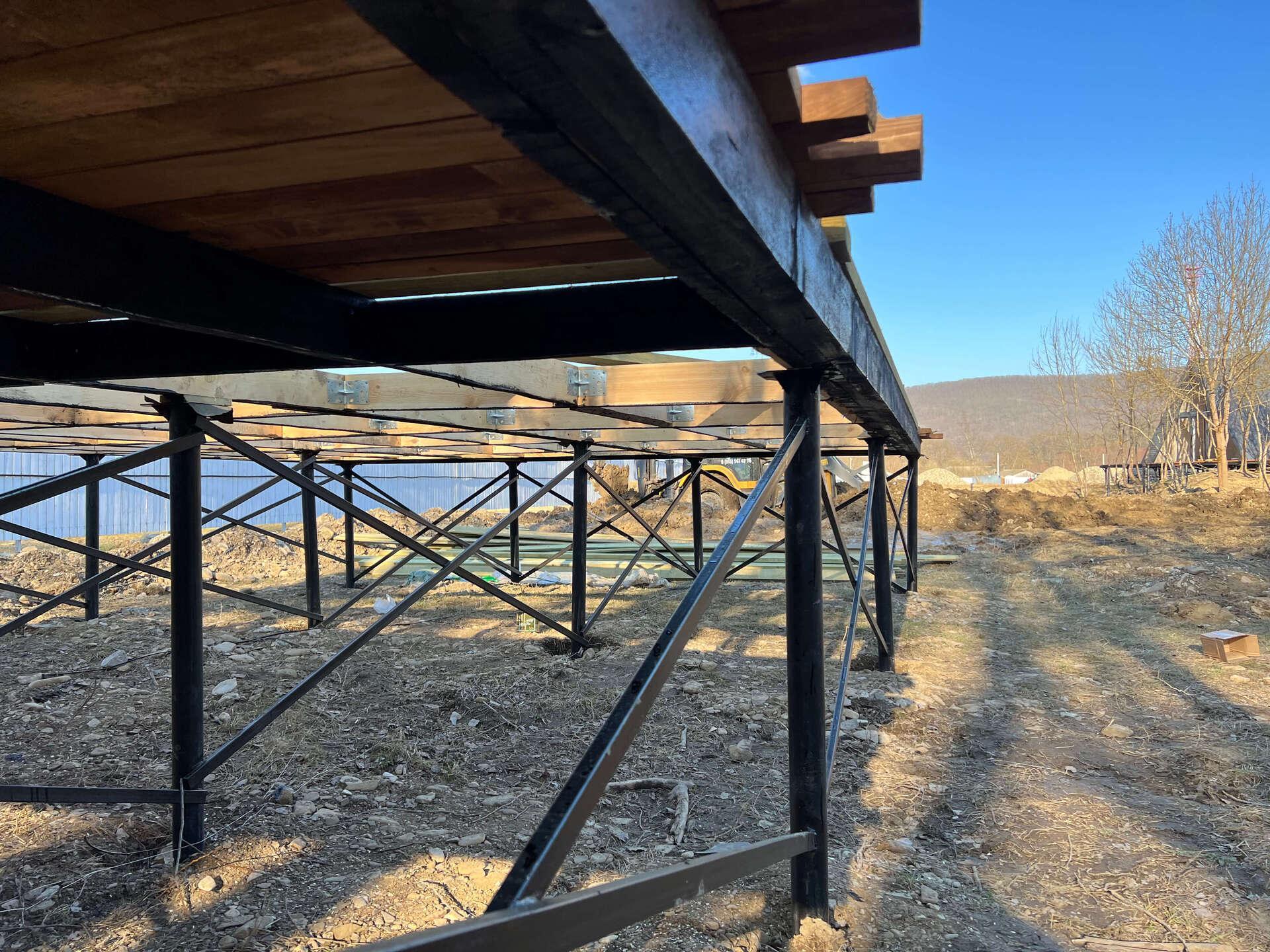 На первом этапе были пробурены металлические 2-метровые сваи под А-фреймы и террасу. Потом произведена обвязка свай профильной трубой.