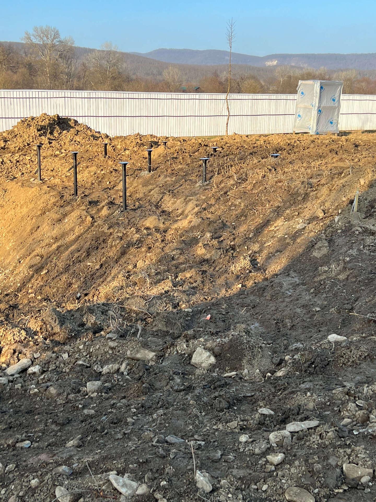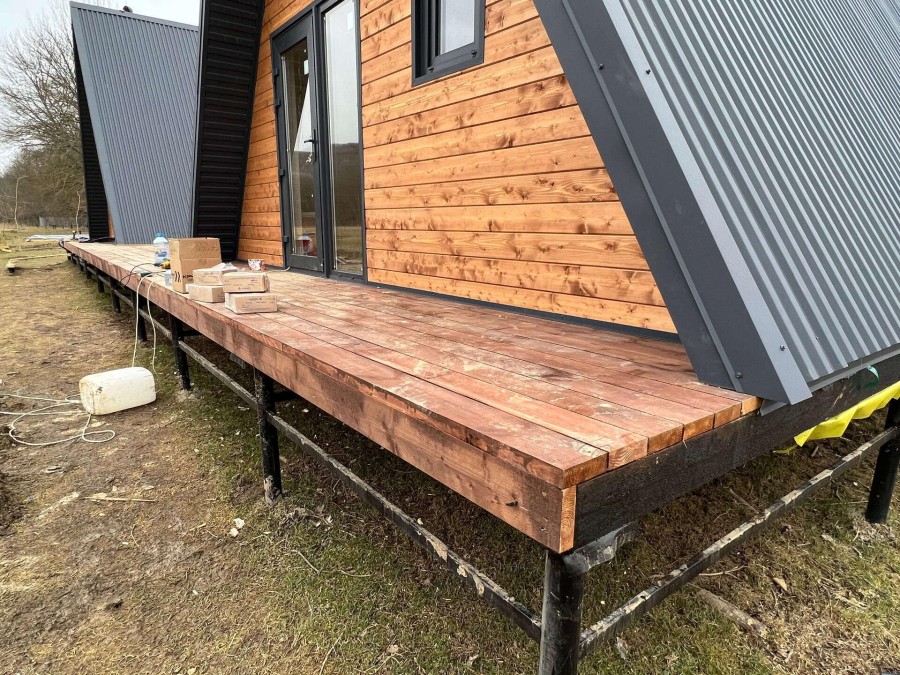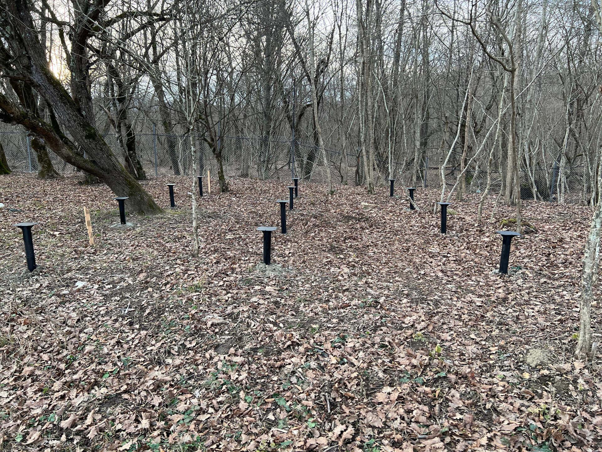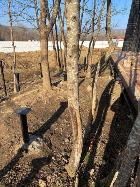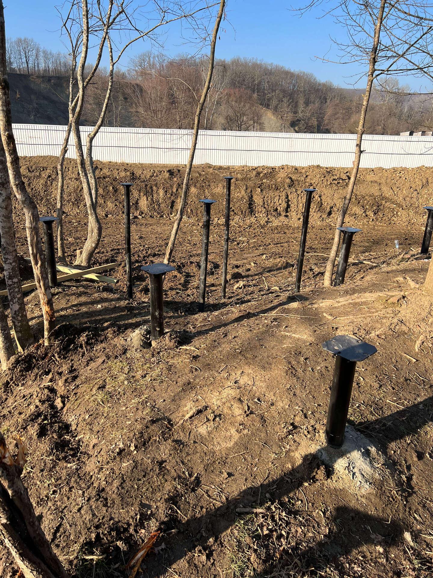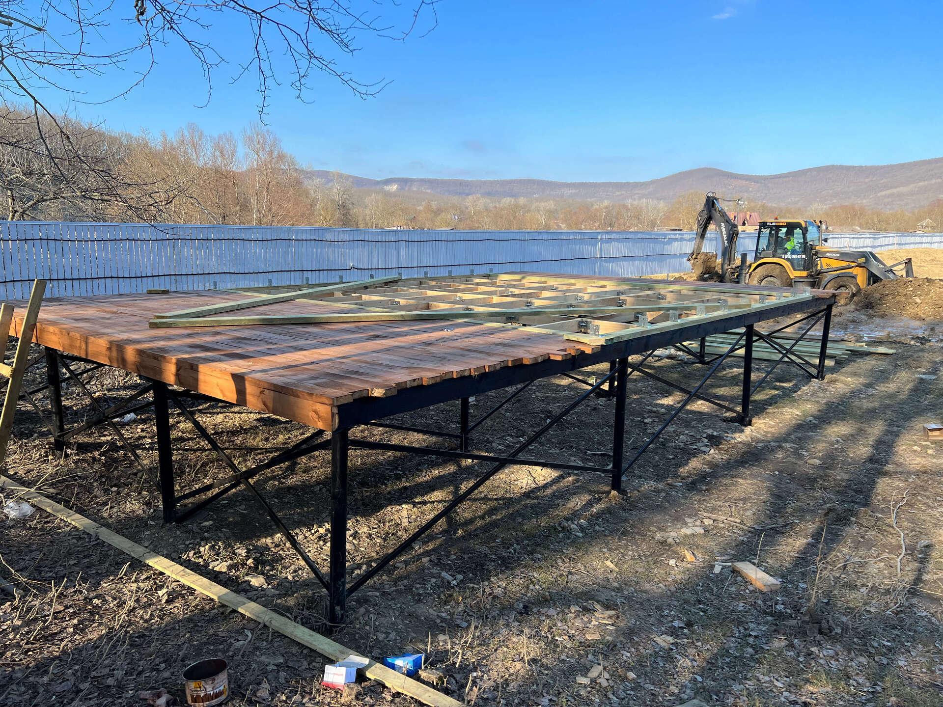 На первом этапе были пробурены металлические 2-метровые сваи под А-фреймы и террасу. Потом произведена обвязка свай профильной трубой.