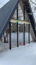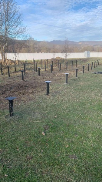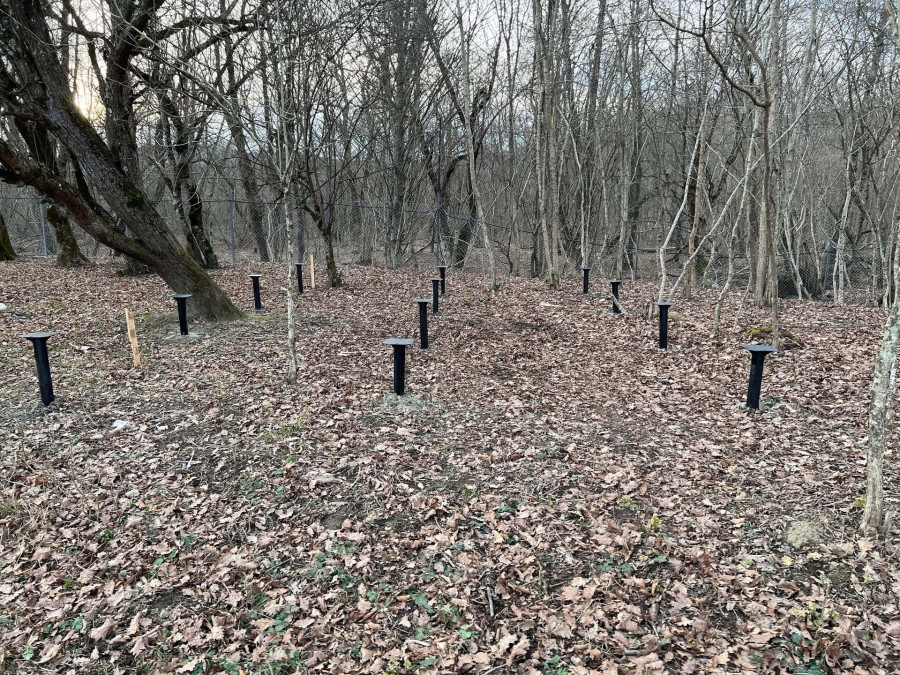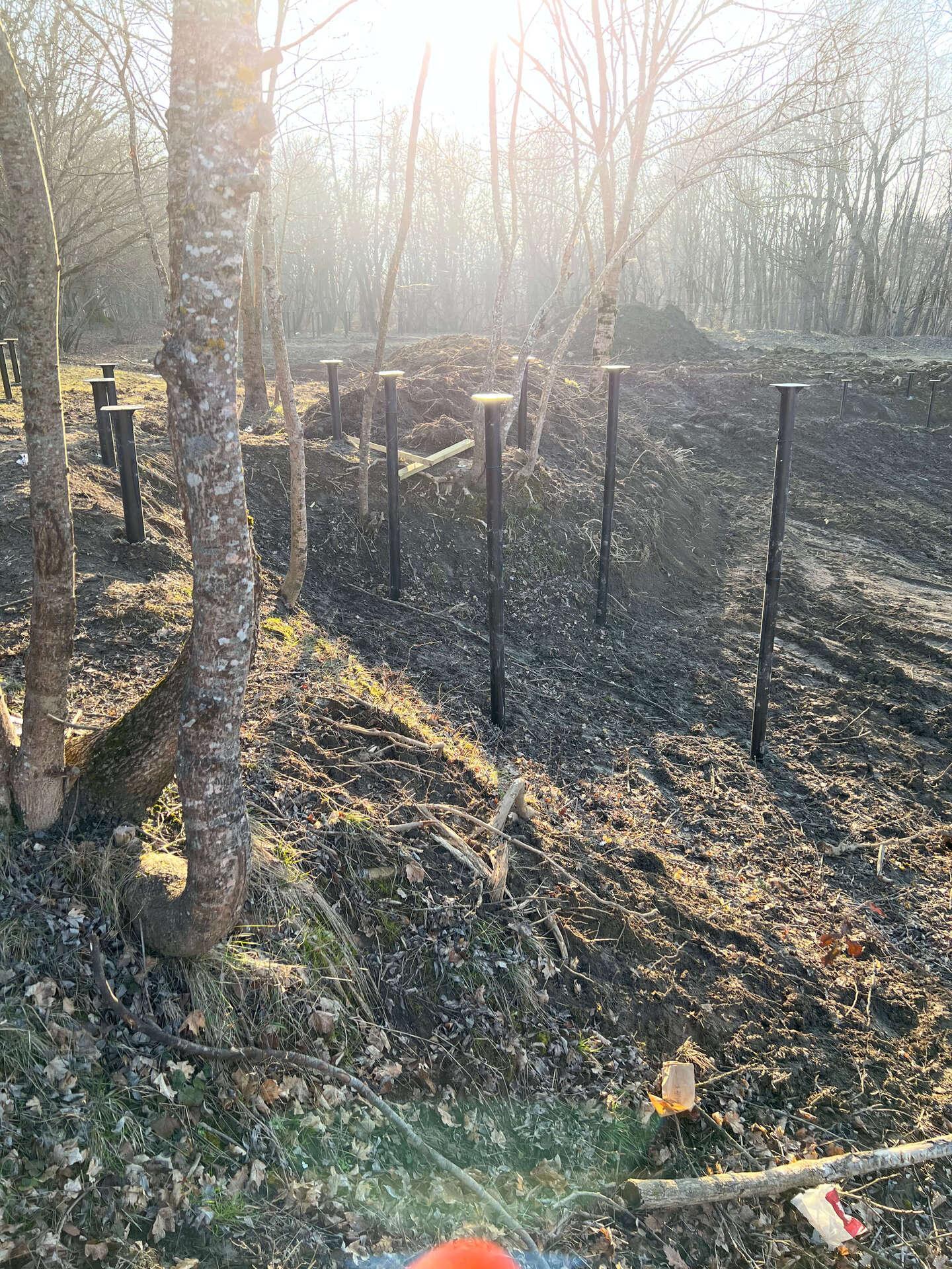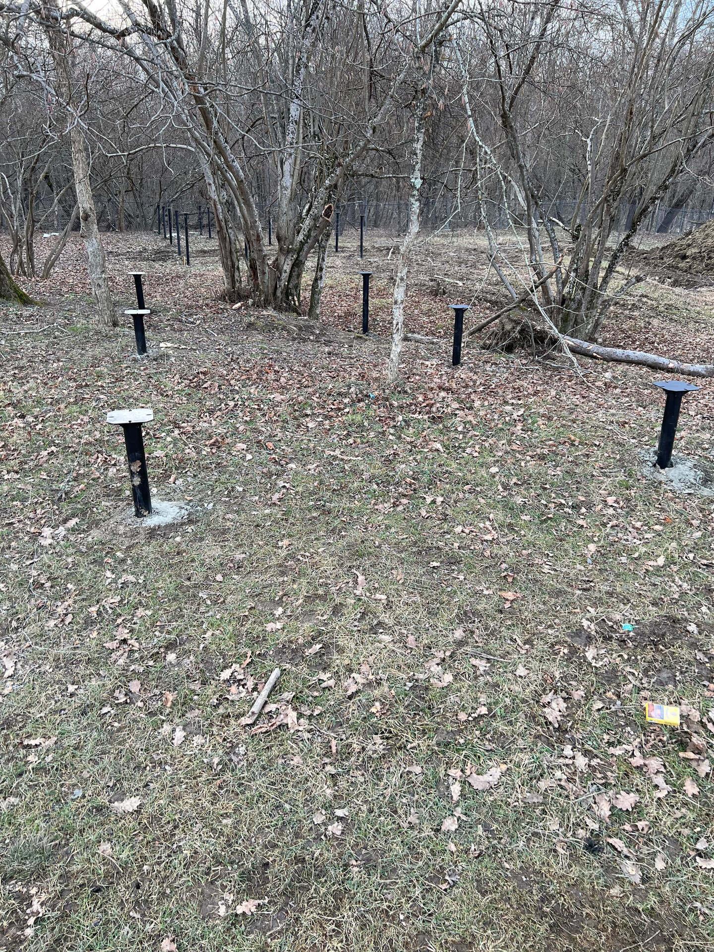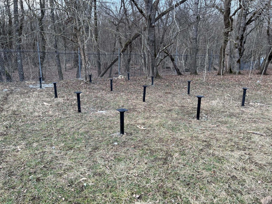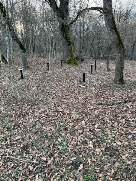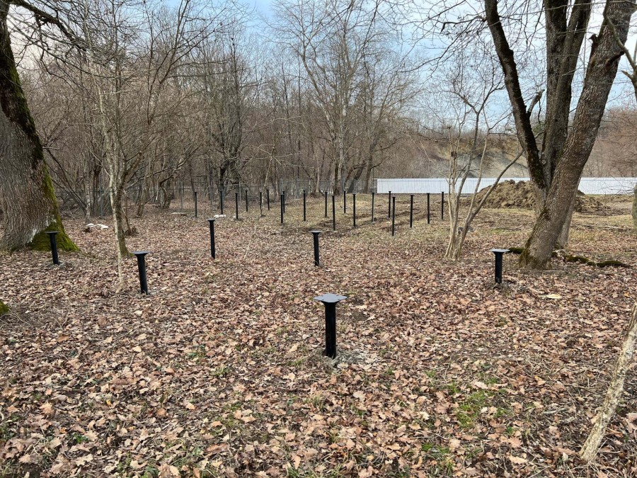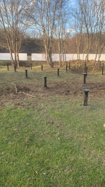 На первом этапе были пробурены металлические 2-метровые сваи под А-фреймы и террасу. Потом произведена обвязка свай профильной трубой.