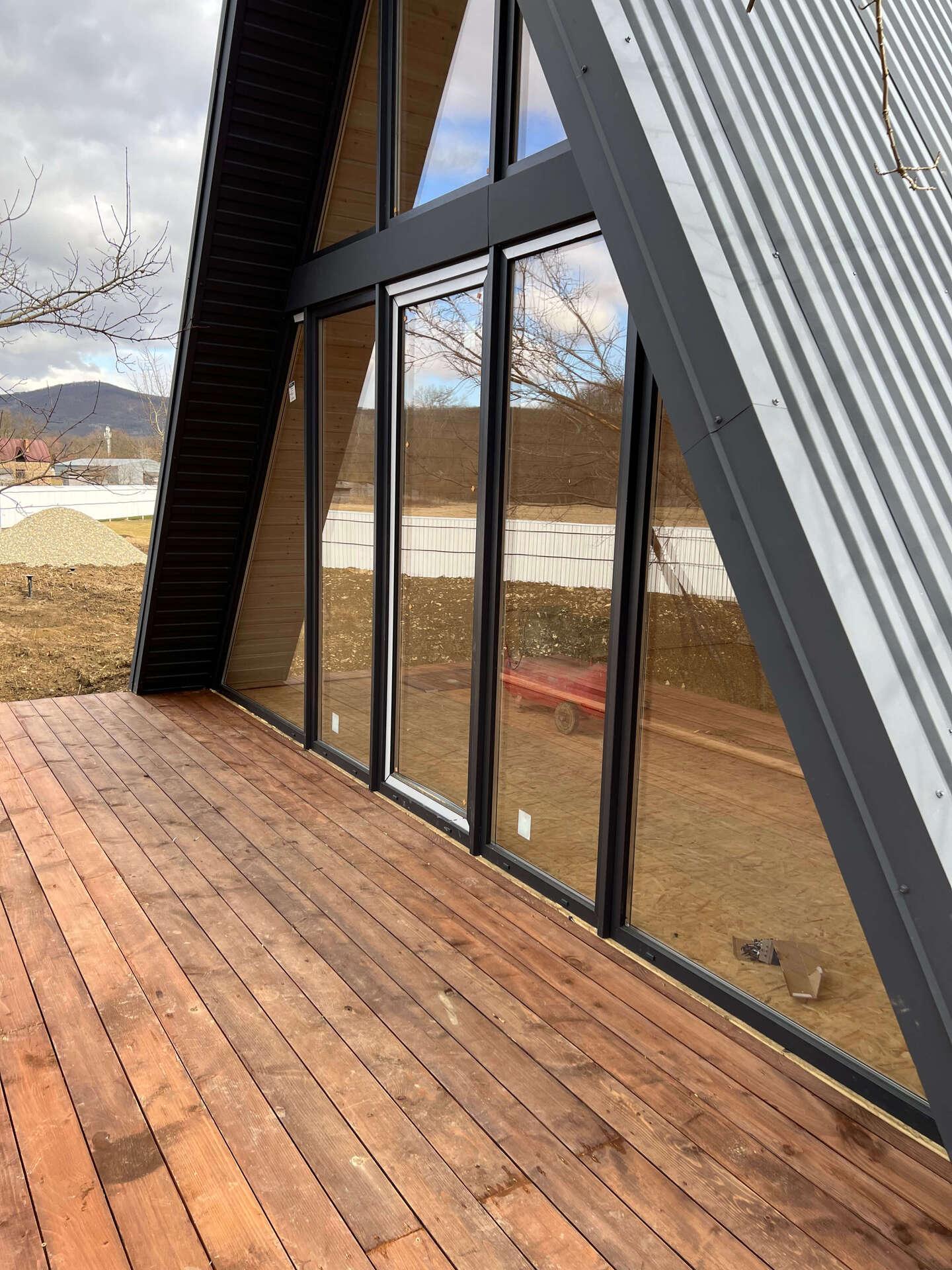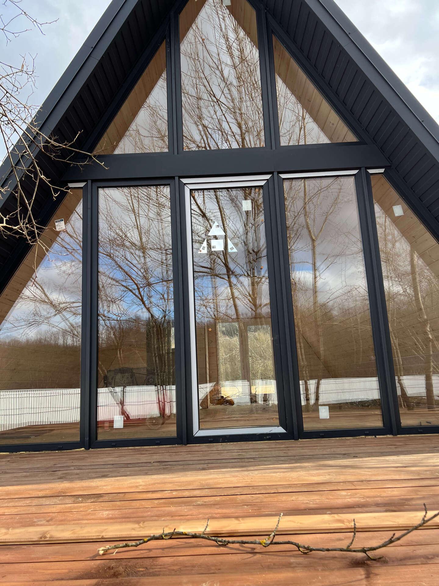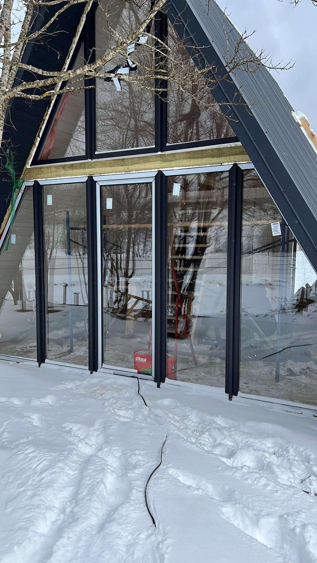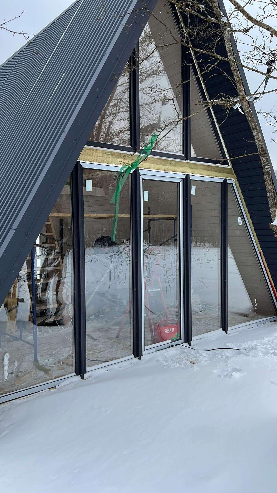 На четвертом этапе остеклили А-фреймы окнами и дверями из ламинированного снаружи ПВХ профиля (цвет Антрацит)