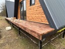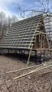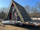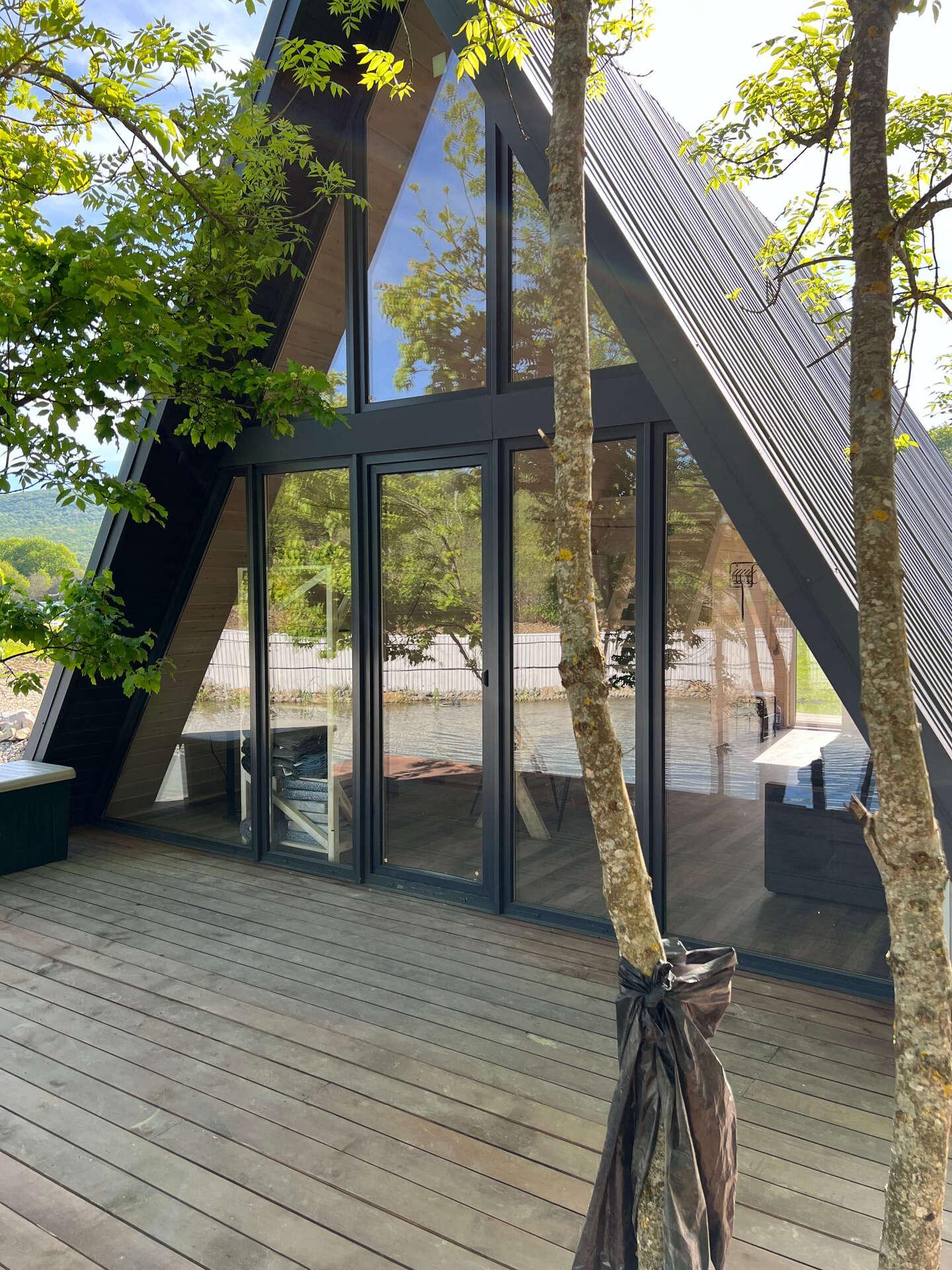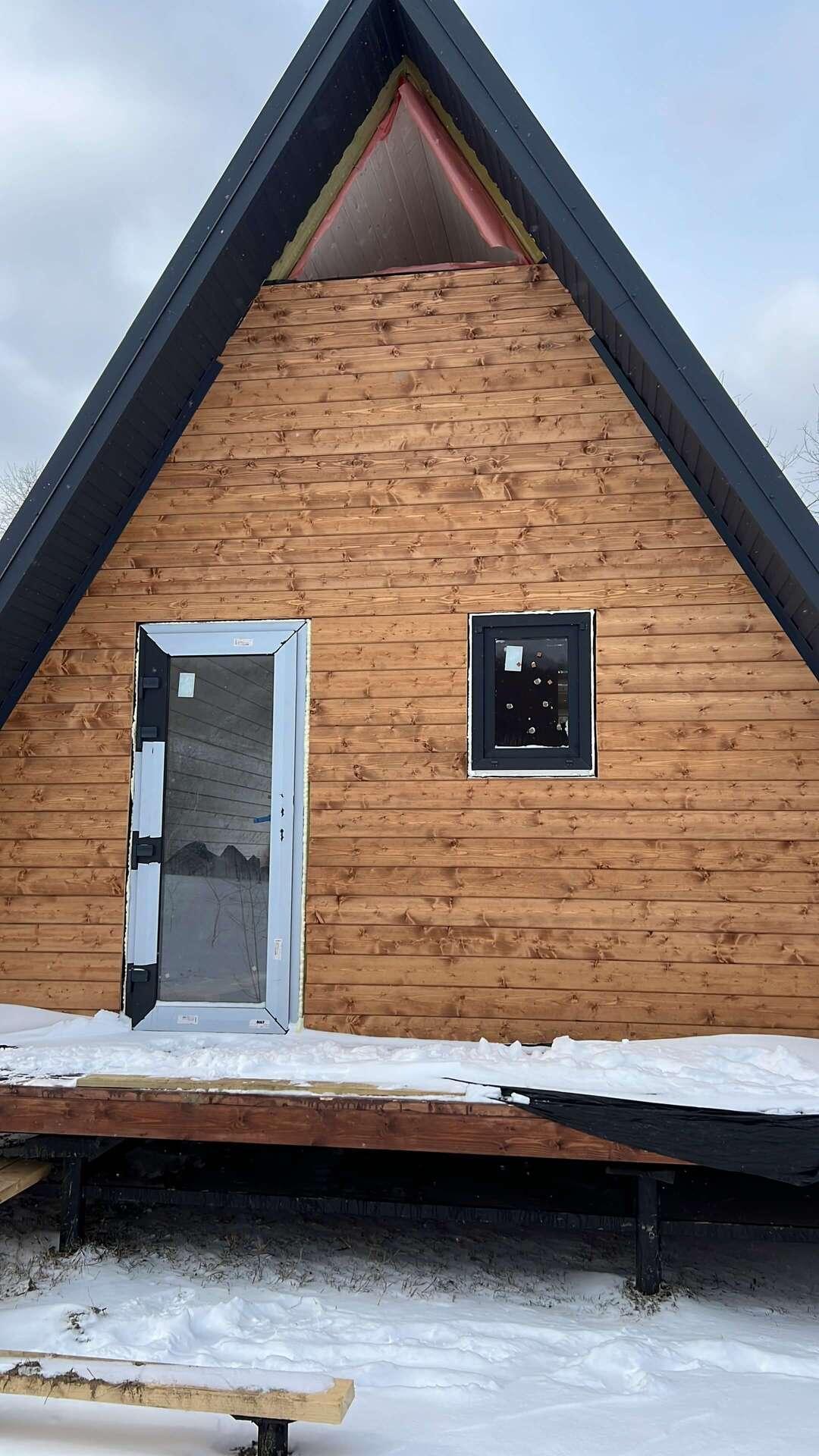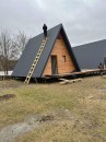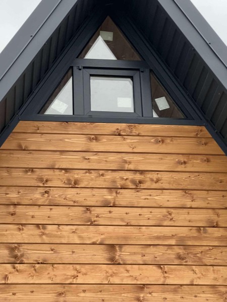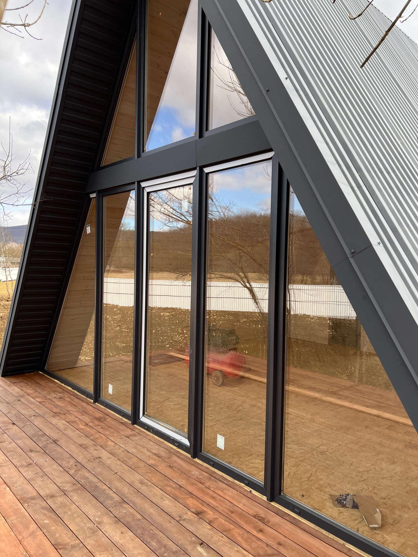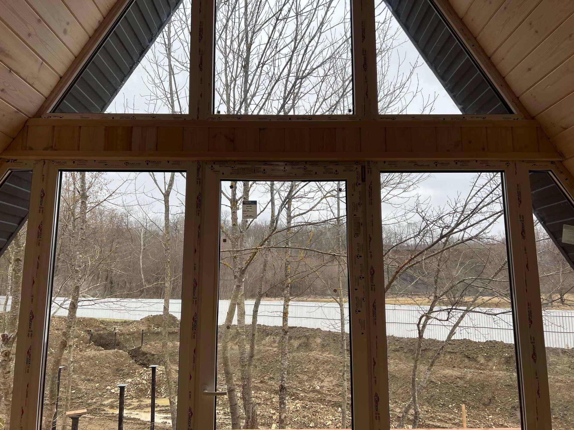 На четвертом этапе остеклили А-фреймы окнами и дверями из ламинированного снаружи ПВХ профиля (цвет Антрацит)