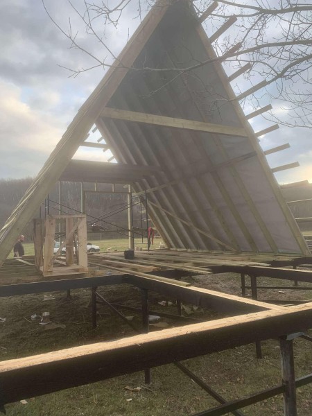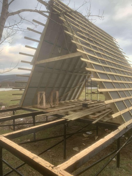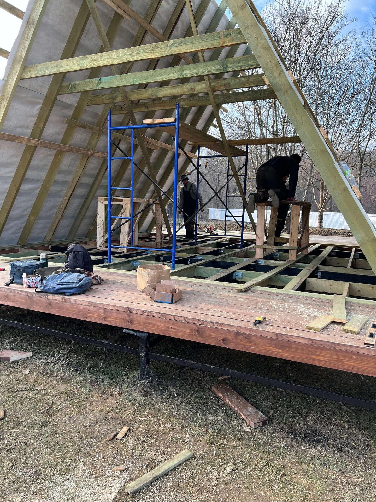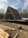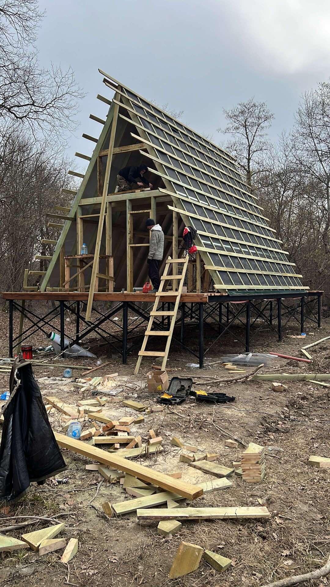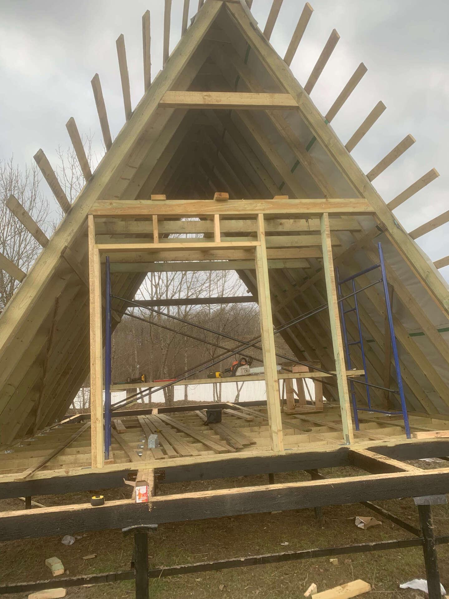 На втором этапе была произведена обвязка пола из бруса 150*50*6000 мм и собраны каркасы А-фреймов из того же бруса.
